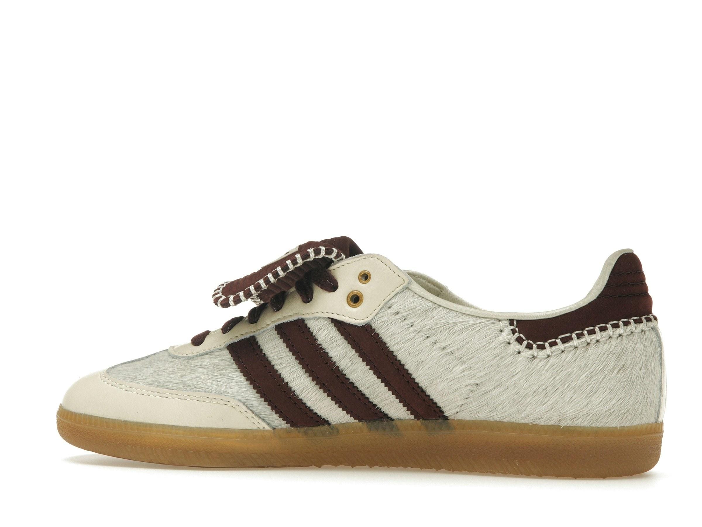 Experimenta el sofisticado estilo de las zapatillas Adidas Samba Wales Bonner de piel en blanco crema. Esta excepcional colaboración entre Adidas Originals y la reconocida marca de lujo londinense Wales Bonner reinventa la icónica silueta Samba con un toque de lujo. Fabricadas con materiales de primera calidad, estas zapatillas presentan una parte superior de mohair peludo en una impresionante combinación de colores blanco crema y marrón misterioso, que evoca la estética universitaria clásica de los años 70. El lujoso mohair aporta una textura única y realza el diseño tradicional de las Samba, haciéndolas perfectas tanto para looks casuales como sofisticados. Manteniendo las características distintivas de las Samba, estas zapatillas lucen tres rayas dentadas en el panel lateral, a juego con la lengüeta plegable, los cordones y los detalles del talón a tono. La estructura de cordones, las punteras y el cuello de piel en blanco crema ofrecen un refinado contraste con la parte superior de mohair. Una resistente suela exterior de goma completa el diseño, garantizando estilo y tracción.