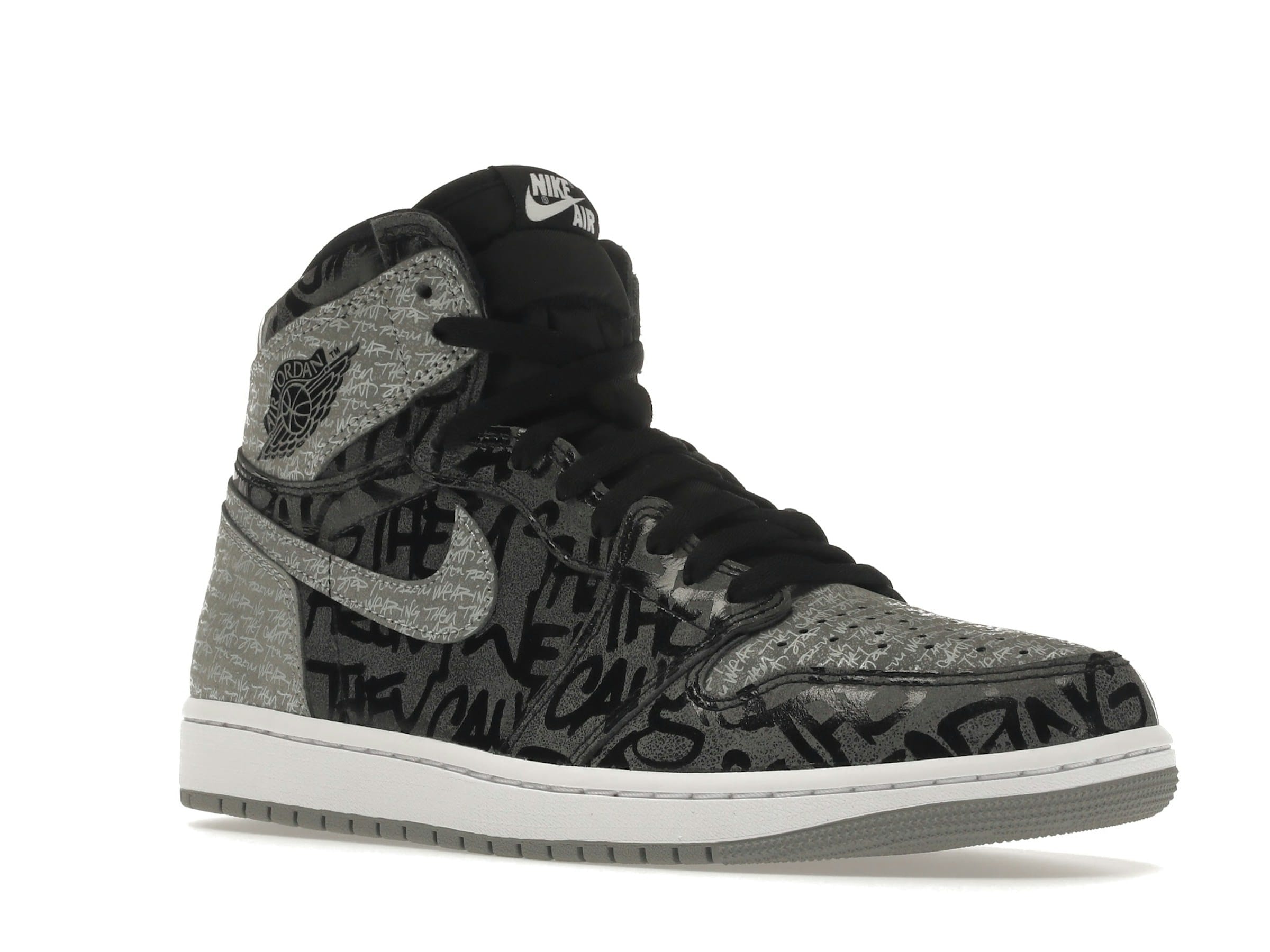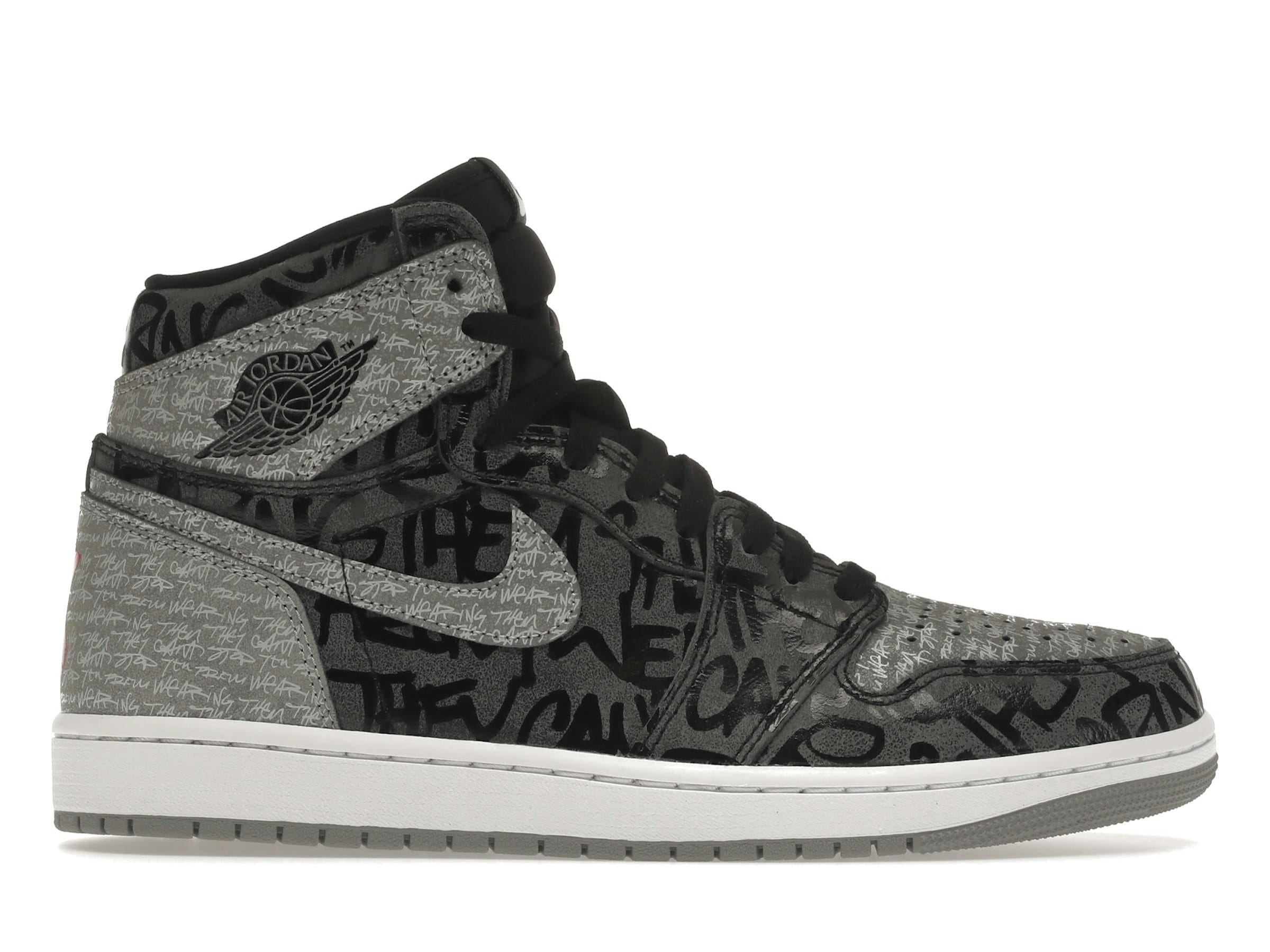 La parte superior de la zapatilla luce un diseño sencillo pero sofisticado en bloques de color negro y gris. Un texto estilo grafiti, impreso directamente sobre la construcción de cuero premium, le aporta un toque rebelde y artístico. El ajuste cómodo y con sujeción que esperas de unas Air Jordan 1 se mantiene en todo momento.