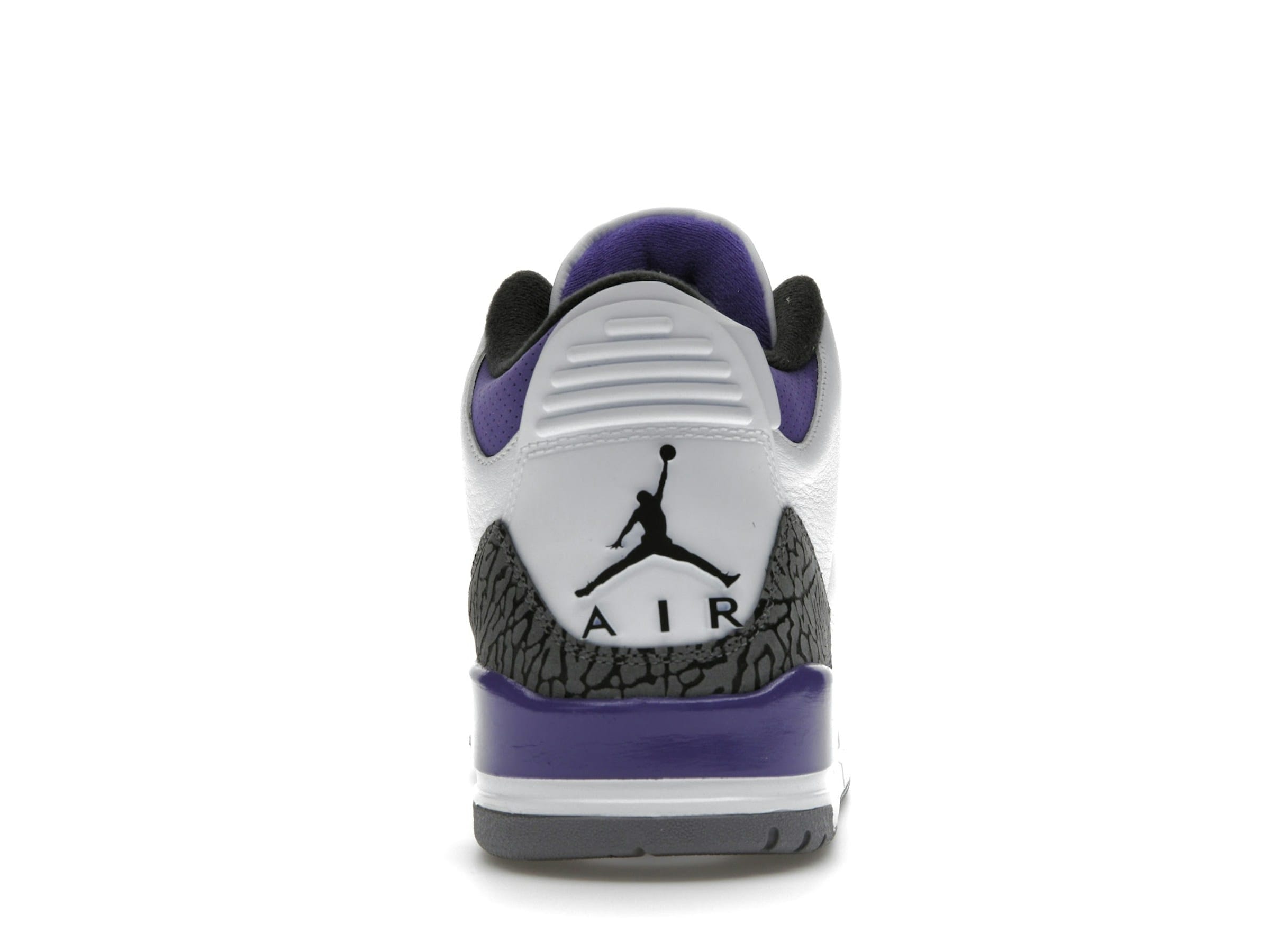 Los llamativos toques de morado iris oscuro acentúan el talón y el tobillo, añadiendo un toque vibrante a una paleta de colores neutros. El sofisticado look de la zapatilla se realza aún más con un interior negro y una capa superpuesta con estampado de elefante texturizado en negro y gris, un elemento distintivo de las Air Jordan 3. Estos detalles se complementan con una entresuela blanca impecable y una resistente suela exterior gris cemento, que ofrecen un equilibrio perfecto entre estilo y funcionalidad.