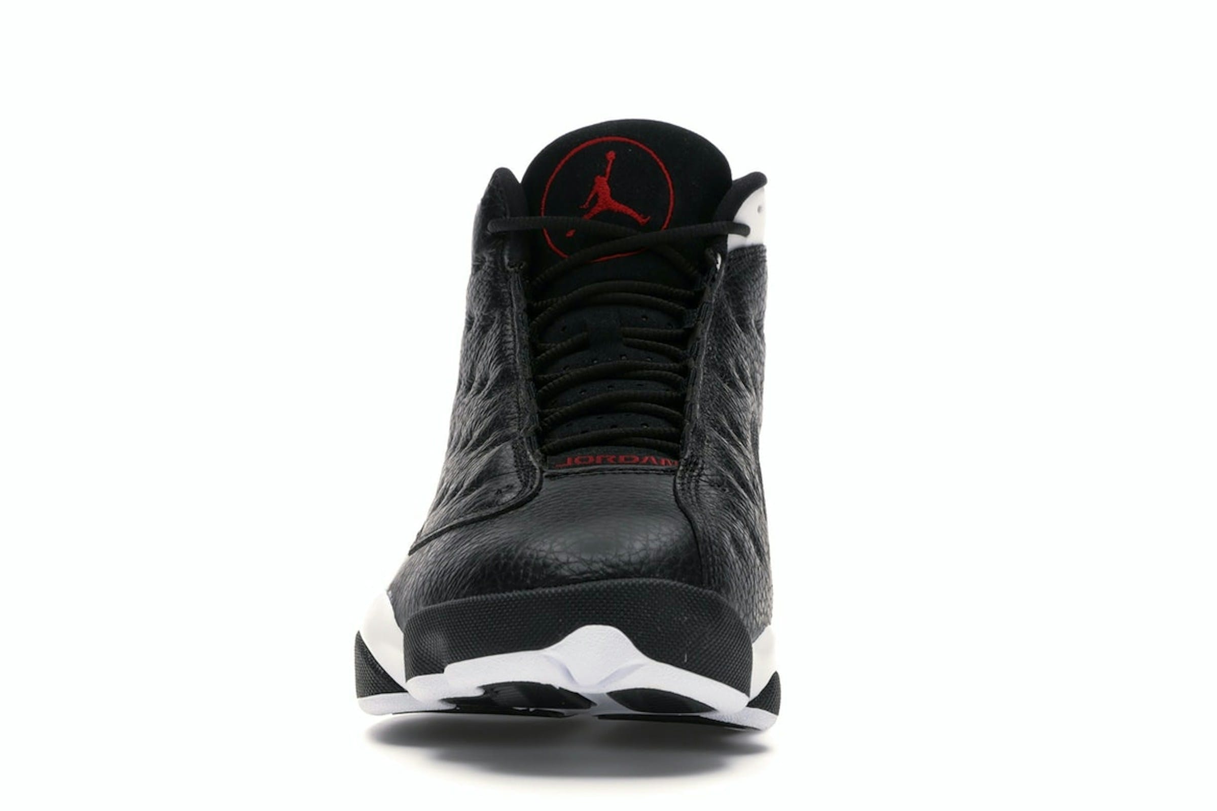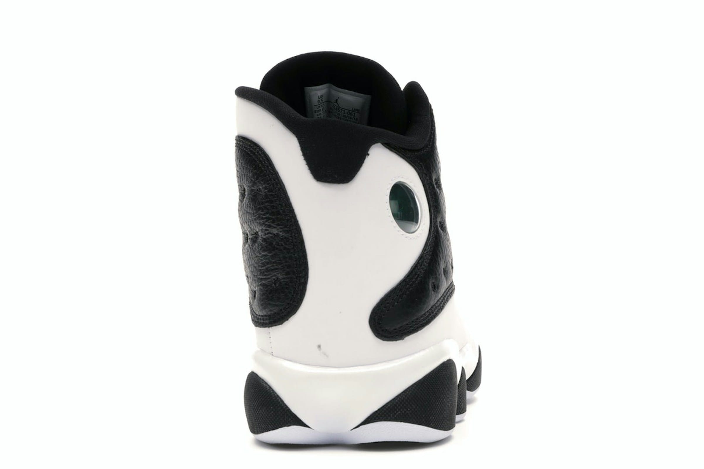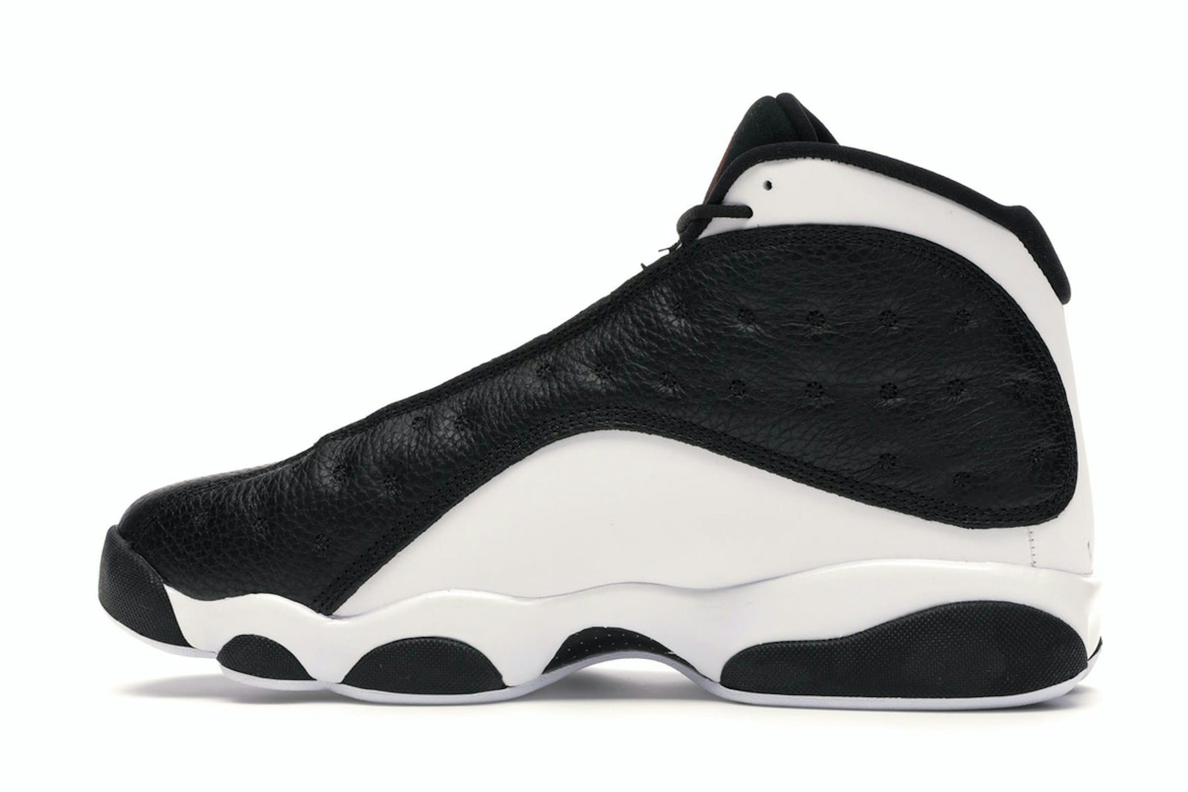 El calzado presenta una parte superior de cuero negro abatanado de primera calidad, acentuada por nítidas superposiciones blancas que brindan un contraste impactante. Los llamativos detalles en rojo añaden un toque de color, creando una estética visualmente cautivadora. Los elementos distintivos, como el icónico holograma en el tobillo, se mantienen fieles al diseño original de las Jordan 13.