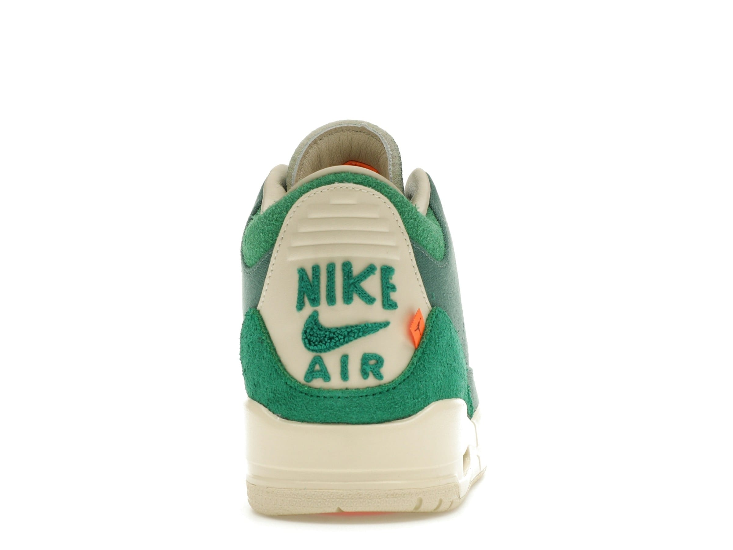La llamativa combinación de colores, que combina verde bicoastal, negro, malaquita y fósil, llama la atención de inmediato. La parte superior de lona y ante verde premium, acentuada por cordones de cuerda, ofrece una estética fresca y moderna. Un logotipo Jumpman modificado en la lengüeta, una primicia en una colaboración retro de Jordan, añade un toque distintivo que muestra el espíritu innovador de este diseño.