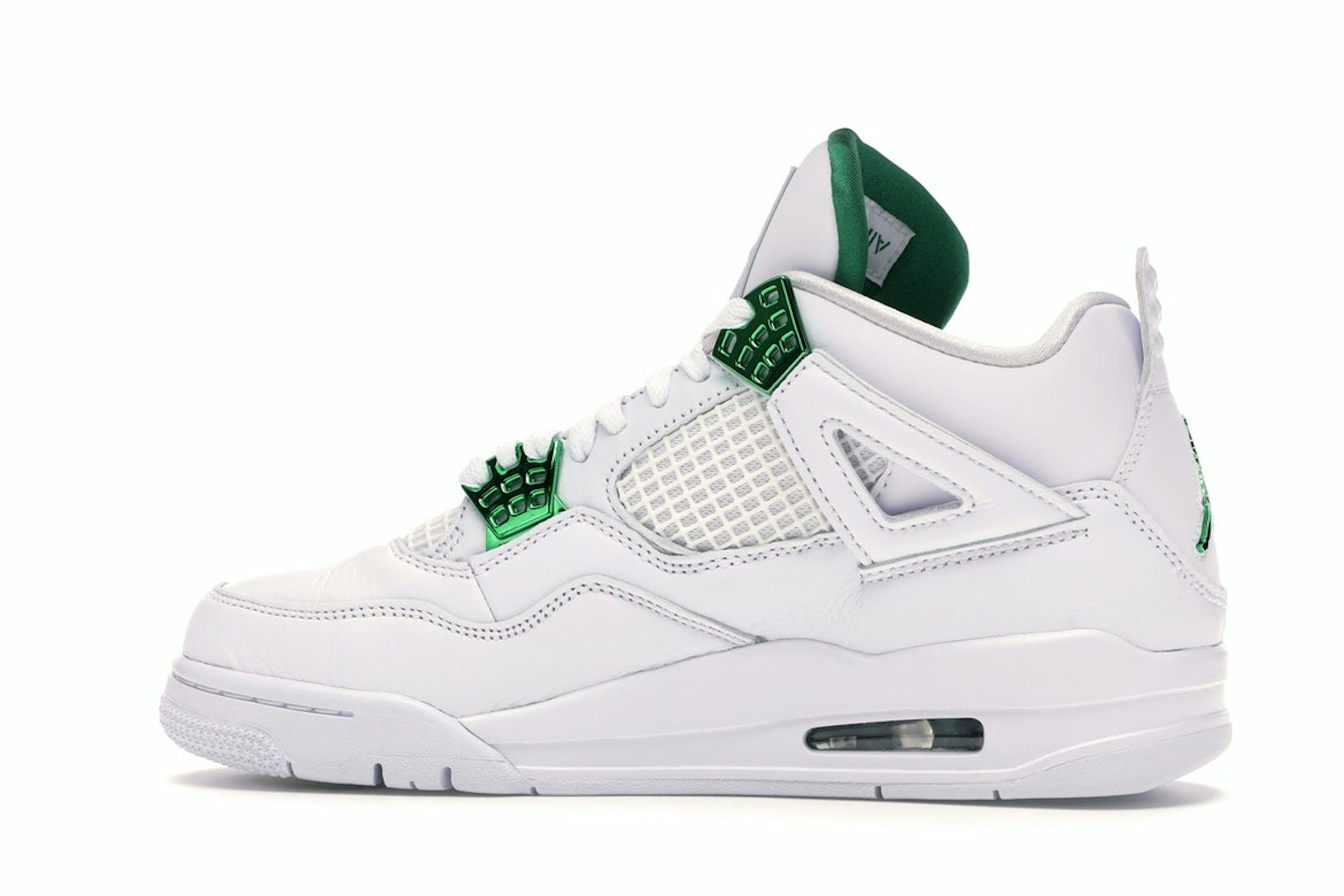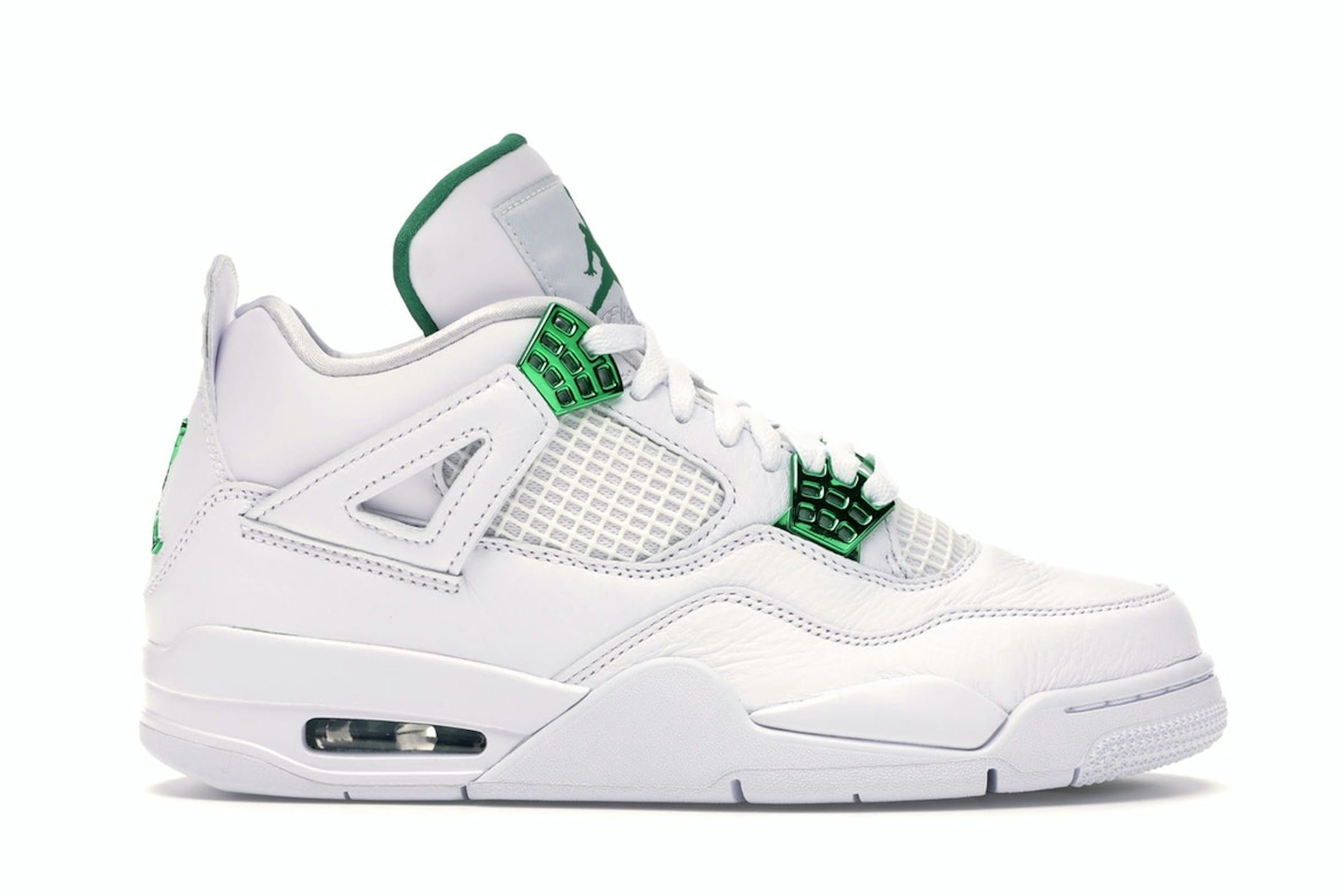 Experimenta el estilo icónico de las Air Jordan 4 Retro Metallic Green (CT8527-113). Estas codiciadas zapatillas rinden homenaje a las combinaciones de colores «Metallic» originales que debutaron en las Air Jordan 1 en 1985, específicamente a la icónica versión verde. El diseño combina a la perfección elementos clásicos con un toque moderno. Una parte superior de cuero blanco impecable proporciona una superficie impecable, acentuada por una red blanca nítida en las capas inferiores. Los detalles en verde metalizado realzan el diseño con elegancia, apareciendo en los ojales superiores, el logotipo Jumpman en el talón y la unidad Air visible en la suela. Este diseño en bloques de color recuerda tanto a las Jordan 1 Metallic Green originales como a las Jordan 4 Retro Classic Green, creando una armoniosa combinación de tradición e innovación. Las Jordan 4 Retro Metallic Green ofrecen una sensación premium con su construcción de cuero flexible y sus meticulosos detalles. Lanzadas en mayo de 2020, estas zapatillas siguen siendo una pieza codiciada tanto para los entusiastas de Jordan Brand como para los coleccionistas de zapatillas de todo el mundo, representando un diseño atemporal con un toque moderno. Este par luce una entresuela blanca clásica que complementa a la perfección la paleta de colores de la parte superior. La combinación de cuero blanco, detalles en verde metalizado y una suela blanca impecable crea un calzado versátil que se adapta a la perfección tanto para uso casual como para salidas más elegantes. El diseño de estas zapatillas es un testimonio del legado perdurable de Jordan Brand y su compromiso con la artesanía de calidad.