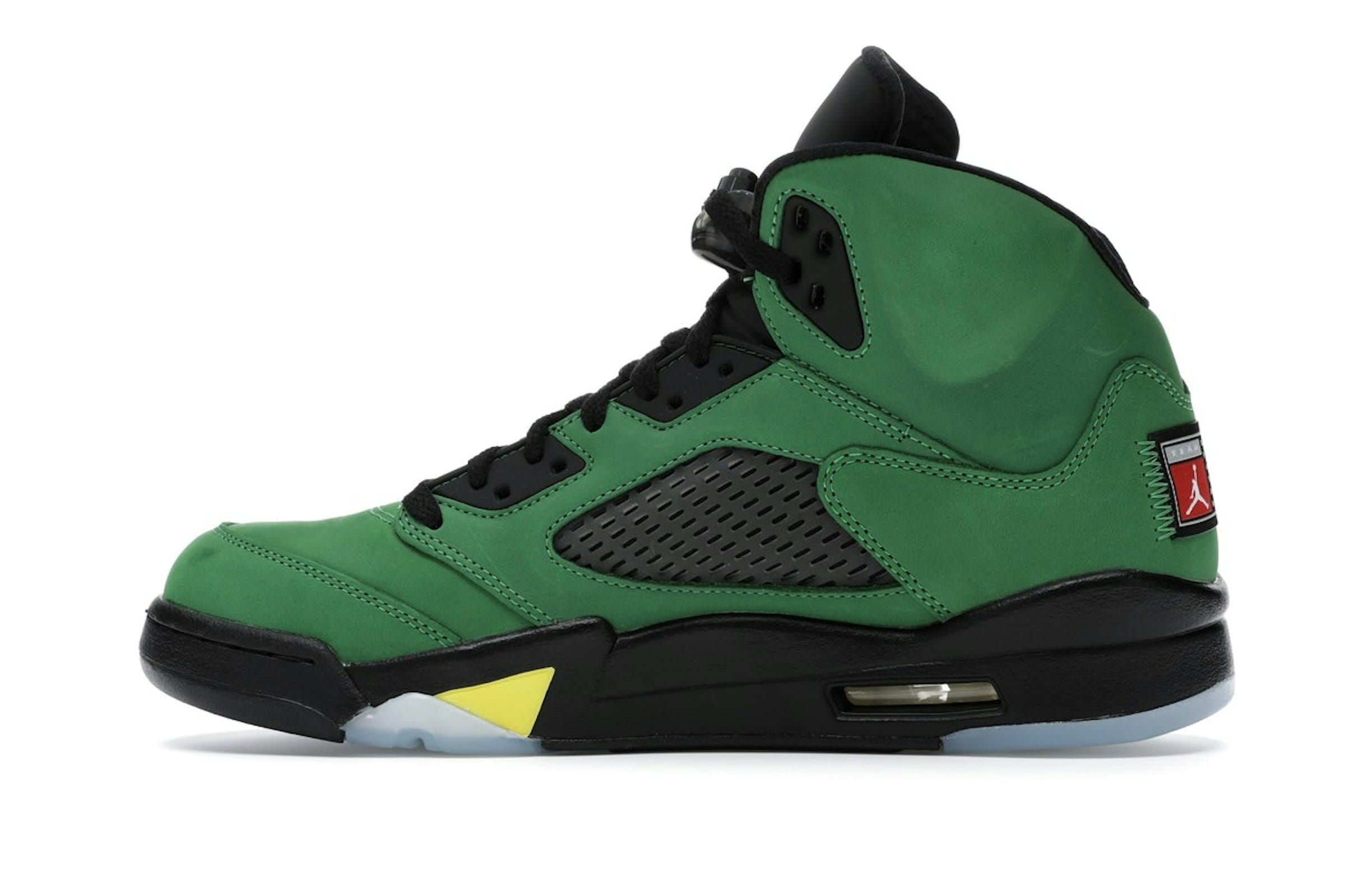Las Jordan 5 Retro SE Oregon, con código de estilo CK6631-307, rinden homenaje a la rica historia deportiva de la Universidad de Oregón. Inspiradas en la versión Player Exclusive (PE) obsequiada a los estudiantes-atletas de Oregón en 2014, estas zapatillas lucen una llamativa parte superior de Durabuck en verde manzana, con detalles en amarillo y negro que les confieren un diseño atrevido y llamativo.