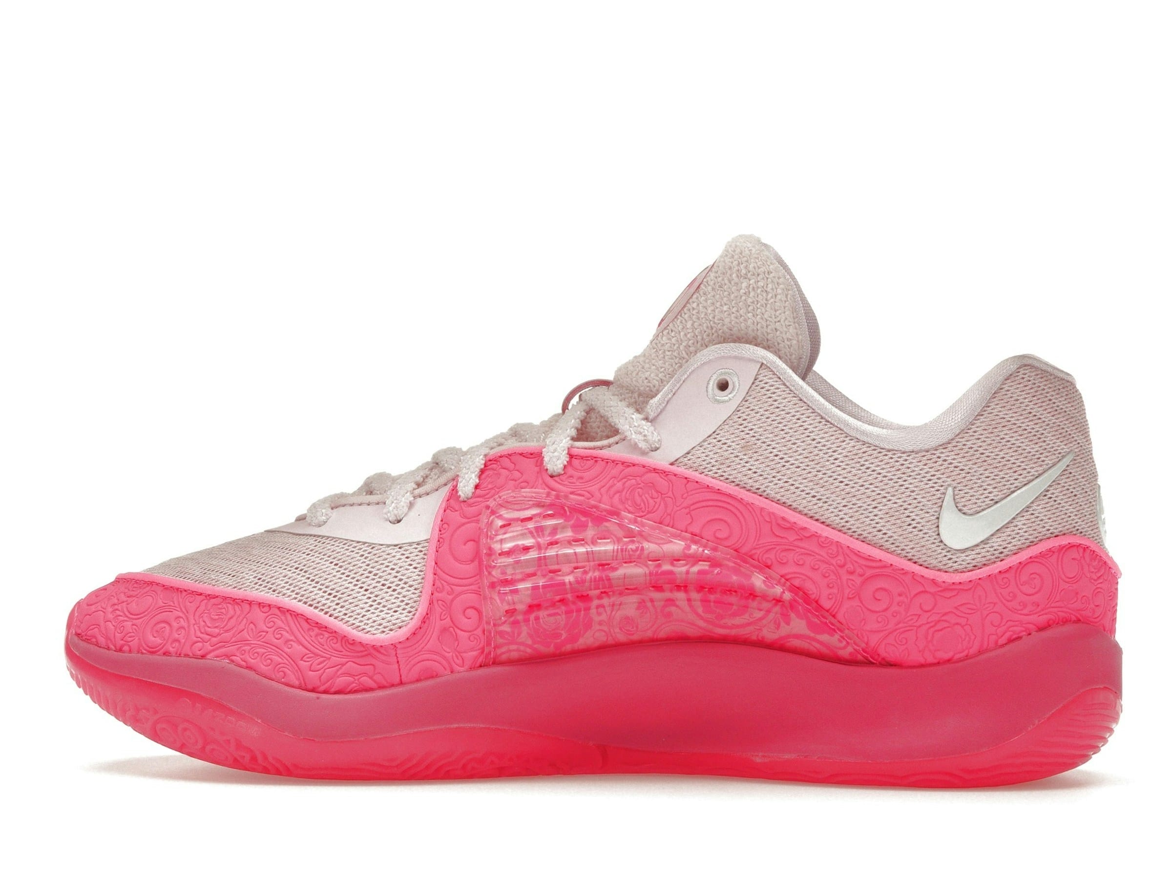 Las Nike KD 16 NRG Aunt Pearl son unas zapatillas de baloncesto de edición especial en honor a la tía Pearl de Kevin Durant, quien falleció de cáncer de pulmón en el año 2000. Este conmovedor homenaje continúa la querida tradición de conmemorar su vida y legado con diseños únicos. La versión de este año se distingue por una llamativa capa con relieve floral sobre la parte superior de malla. Un hermoso estampado paisley añade detalles intrincados, mientras que las resistentes alas de soporte de TPU, adornadas con flores que imitan rosas bajo un sello transparente, se conectan a la entresuela, proporcionando estilo y estabilidad. La zapatilla cuenta con un sistema de amortiguación cómodo y eficaz, con una entresuela de Phylon con una unidad Zoom Air en el antepié y una unidad Air Strobel de alta respuesta bajo el talón. La vibrante combinación de colores combina blanco, rosa intenso, espuma rosa e hiperrosa, creando una zapatilla visualmente cautivadora. Los cordones afelpados realzan la sensación de lujo de la zapatilla. Estos cordones de color claro complementan a la perfección la malla textil de la parte superior y la lengüeta tejida. Las Nike KD 16 NRG Aunt Pearl son imprescindibles tanto para los amantes de las zapatillas como para los jugadores de baloncesto que aprecian el diseño y el rendimiento de alta calidad.